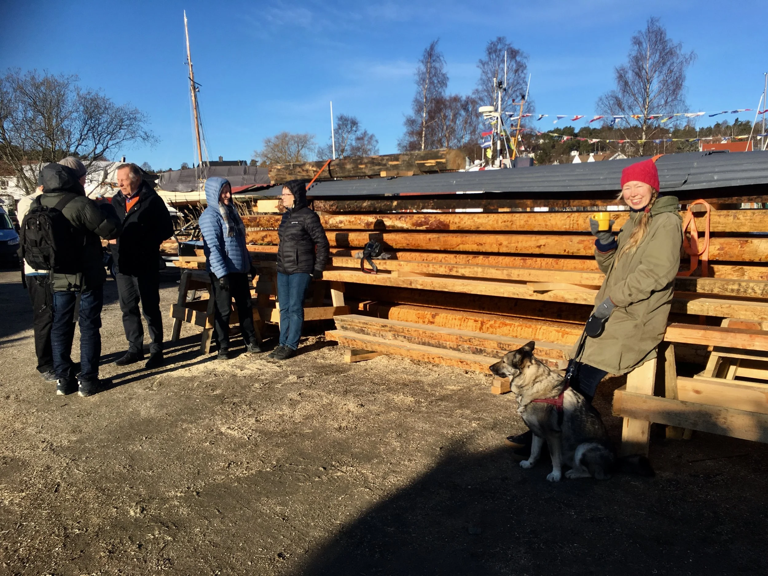 Når prammen endelig lå trygt på plass, fikk vi klarsignal til at NÅ kunne vi få lov til å applaudere. Og det gjorde vi!selvfølgelig! Alt gikk - i følge byggeleder Andreas Pagander, nesten etter planen.. Det ble noen utfordringer da et par av stroppene forskjøv seg litt når trykket avtok, men med noen korrigeringer endte det bra. Godt jobbet!